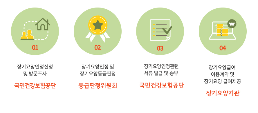 ※ 장기요양인정 신청자격 : 장기요양보험 가입자 및 그 피부양자 또는 의료급여수급권자 중 만 65세 이상의 노인 또는 만 65세 미만자로서 치매, 뇌혈관성 질환 등 노인성 질환을 가진 자